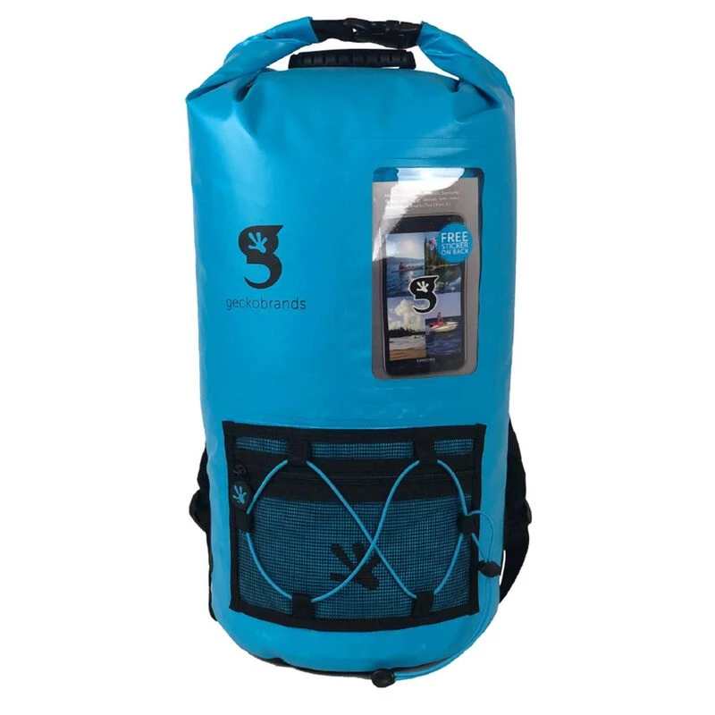 This backpack features a 20L capacity, durable pvc tarpaulin material and a sleeve to store and still use your phone. Have easy access to gear with the outside mesh zip pocket and bungee cords.