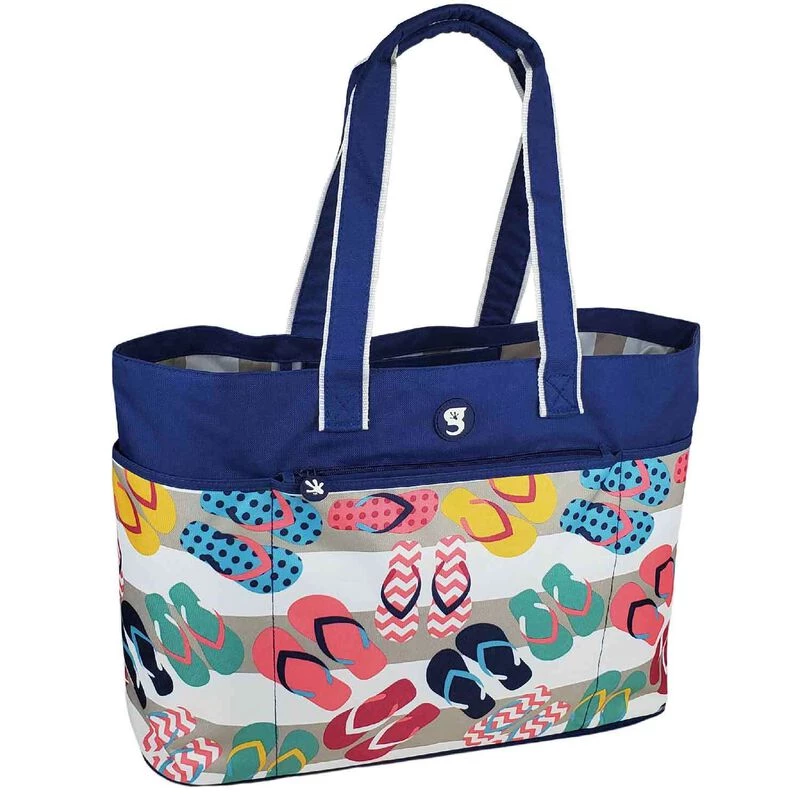 Pack and store everything you need for the pool, beach or other activity. The oversized tote has 5 pockets and durable handles. Plus, the inside liner offers a contrasting look to the outside pattern.
