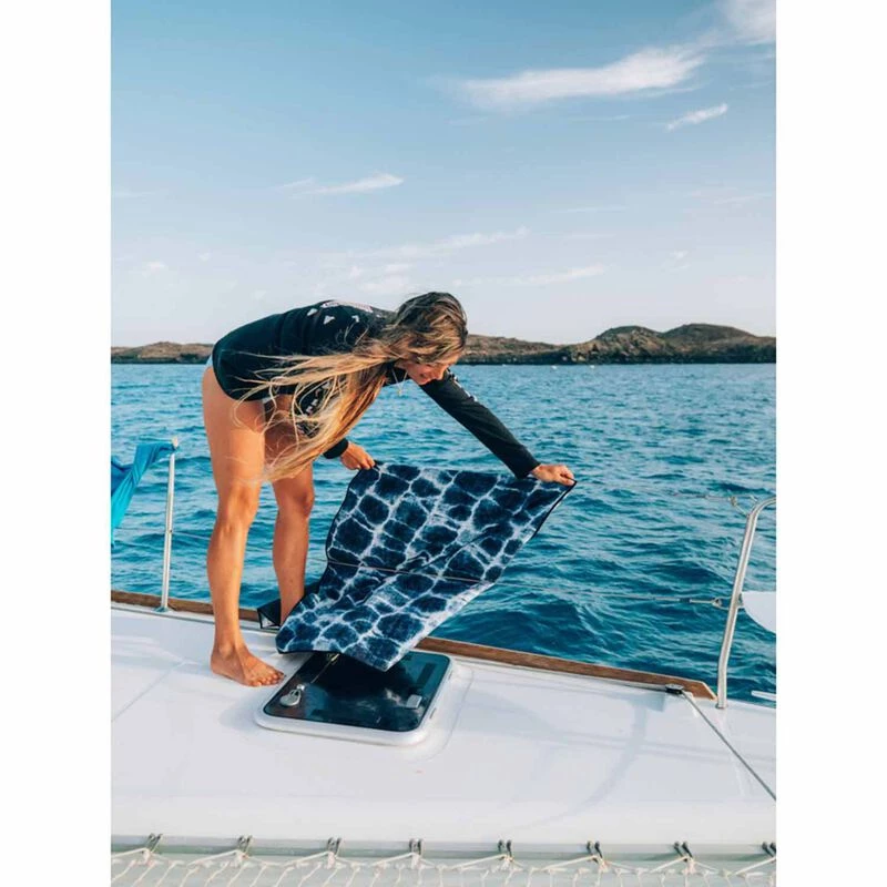 It’s a top of the line boating towel, it’s your beach towel, it’s your yoga towel, and it’s a pack towel when you go camping or travel. Designed to be versatile without sacrificing performance, so you can own less and do more. Imported