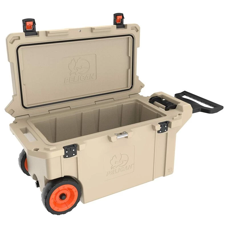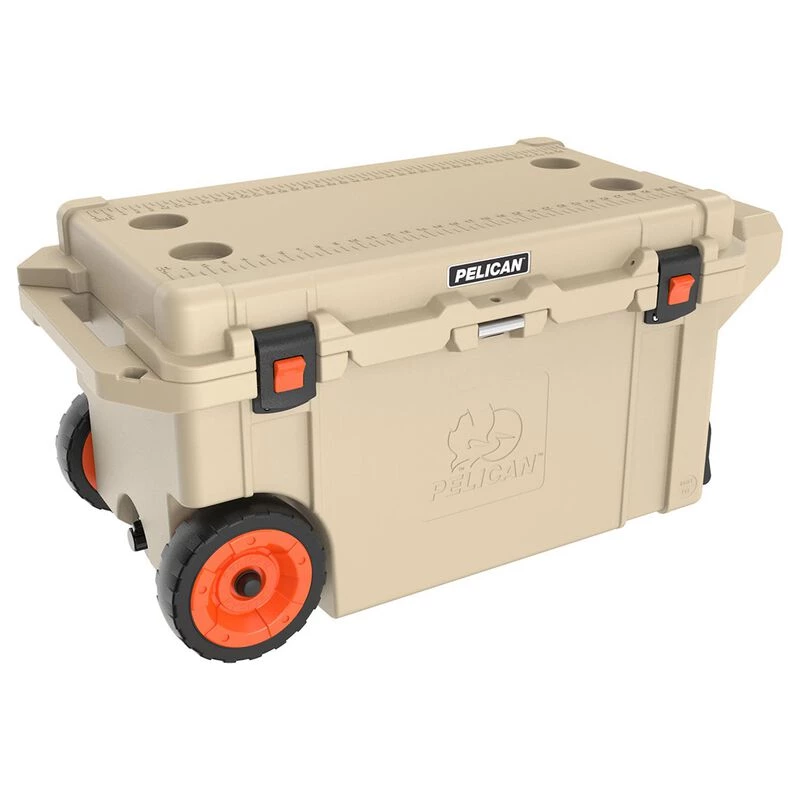 Pelican Elite 80 Quart Wheeled Cooler. Full 80 Quart internal acpacity. Up to 10 days ice retention, freezer grade gasket, 2″ polyurethane insulation. Press & Pull Latches (Wide for Gloved Use). Integrated Fish Scale on Lid. Heavy duty wheels.